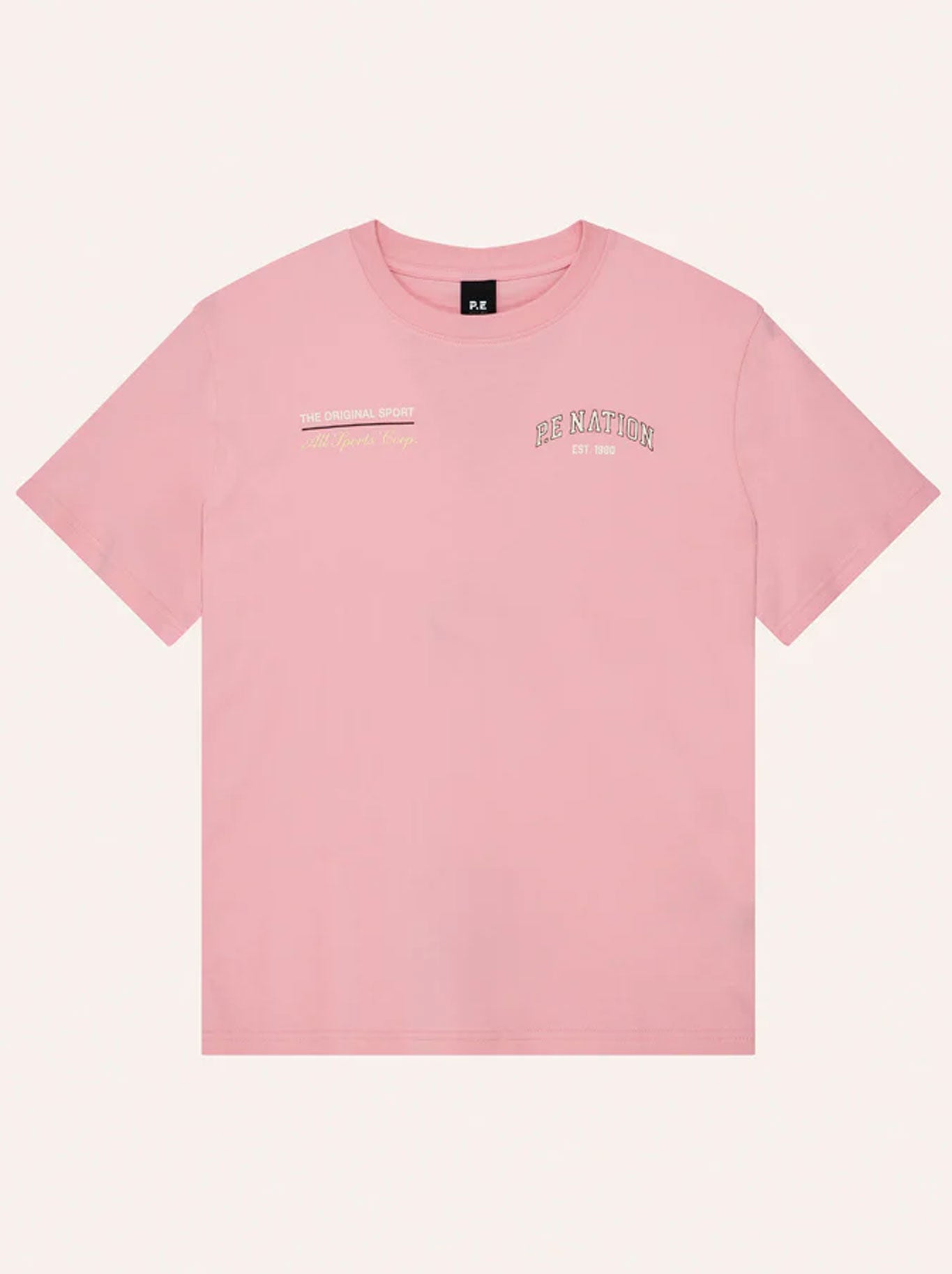 The Base Tee in Candy Pink is made from a 100% medium-heavy cotton jersey. This relaxed fit short sleeve tee features a ribbed crew neck and a custom P.E Nation seasonal graphic print on front and back. Style this tee with a track pant, leggings or bike short for laid back days.