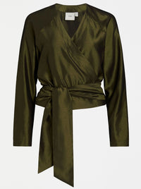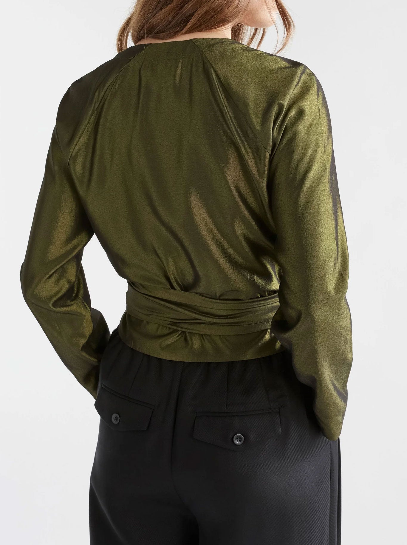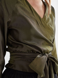 The Elk Medjal Top is a wrap-style top cut from metallic fabric, woven with black and gold yarns for a rich, light-catching finish. The cropped silhouette wraps at the waist with self-fabric ties, while soft gathers at the bodice create fluid shape. Raglan sleeves offer a relaxed feel, balanced by a sophisticated V-neckline.