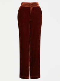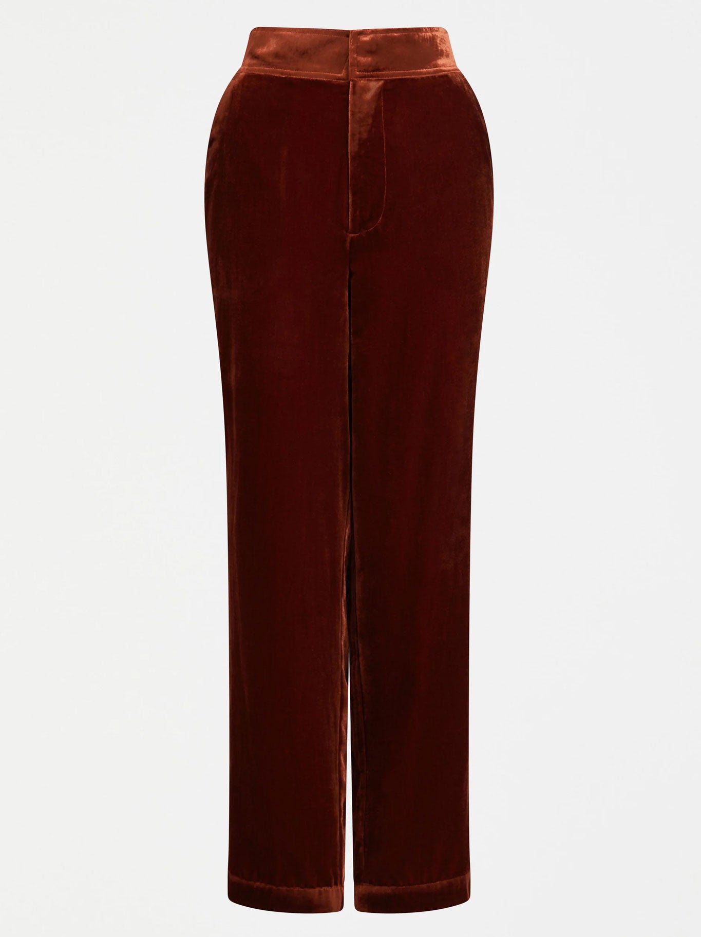 A tactile velvet update to a classic tailored pant. Reimagined for another season, these velvet Elk pants add warmth and texture to your wardrobe in a new smoky paprika shade. Tailored for a sleek look, they feature a flat waistband at the front and an elasticated back waist for a comfortable fit. Style with the matching Suuri Zip Jacket for a coordinated look, or pair simply with a white tee and a loafer.