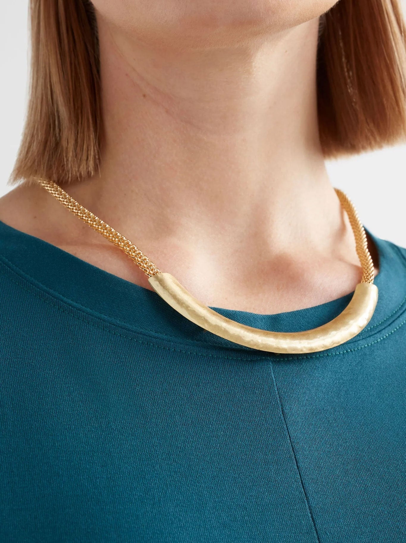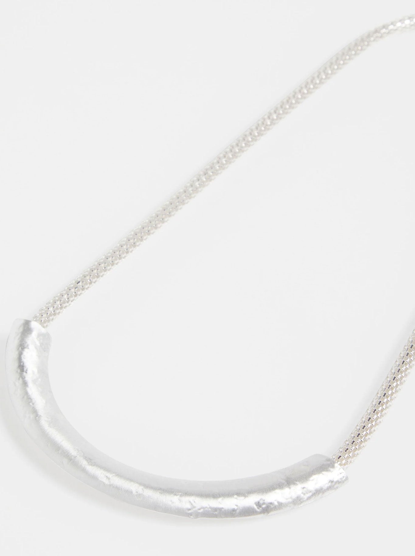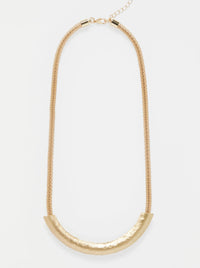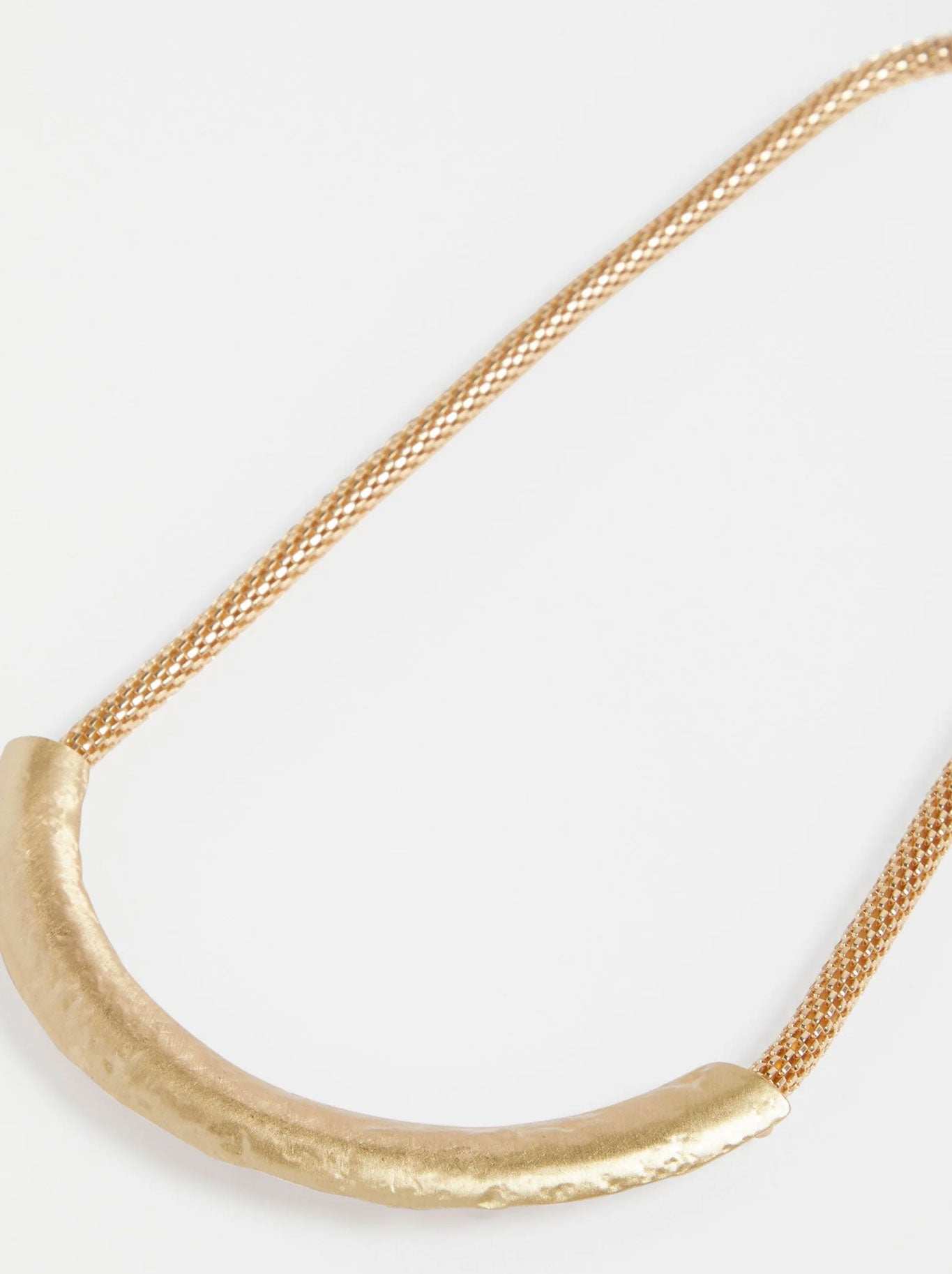 The Gild Necklace joins ELK's classic Gild Collection. A tubular snake chain is looped through a curved half-moon component and secured by jump rings. Resting flat against the chest, this statement piece offers timeless elegance. This necklace has a standard parrot clasp and extension chain. Offered in classic Gold and Silver colourways.