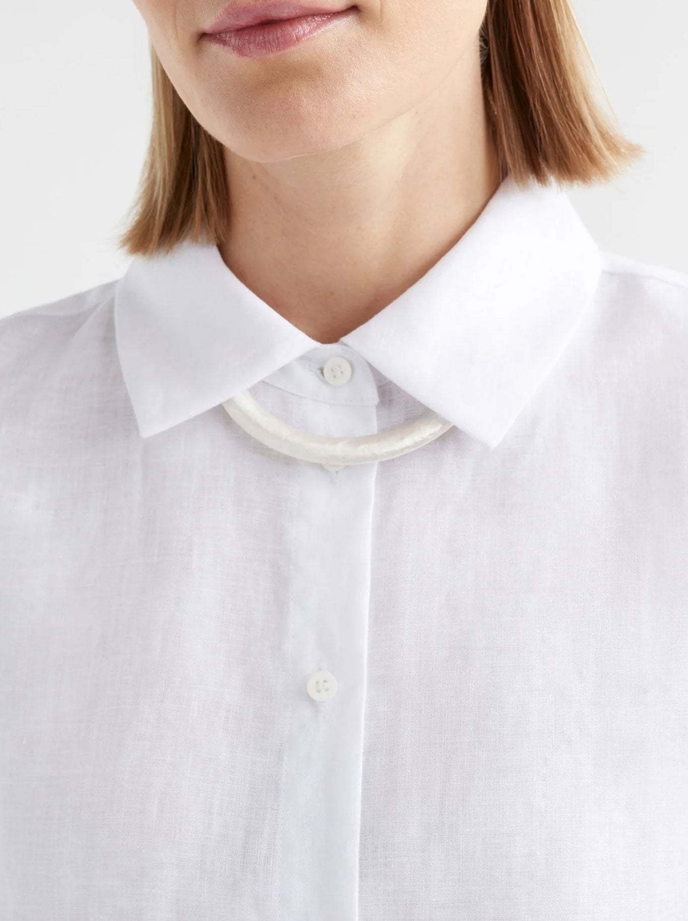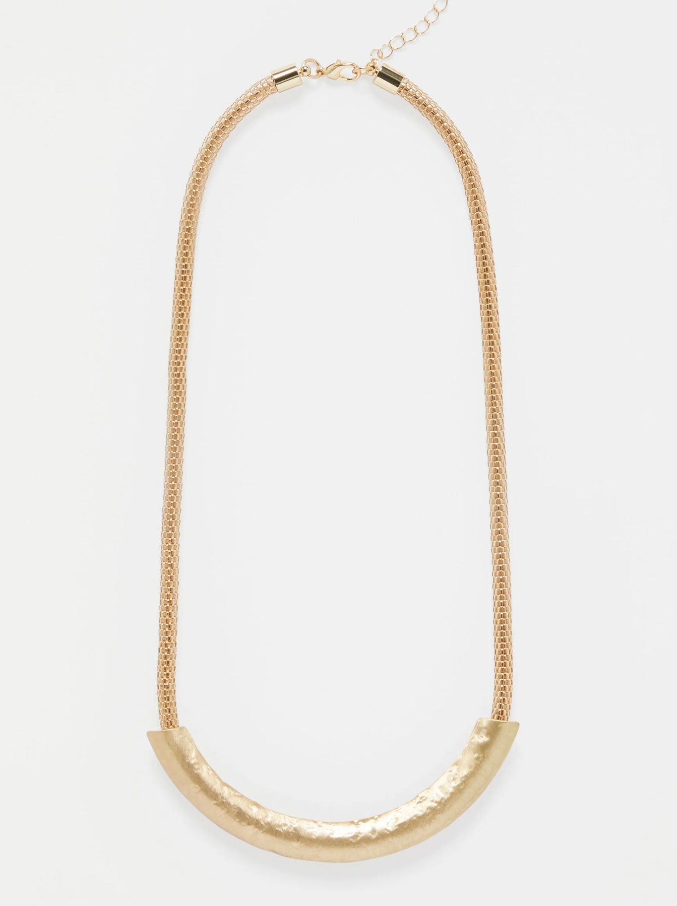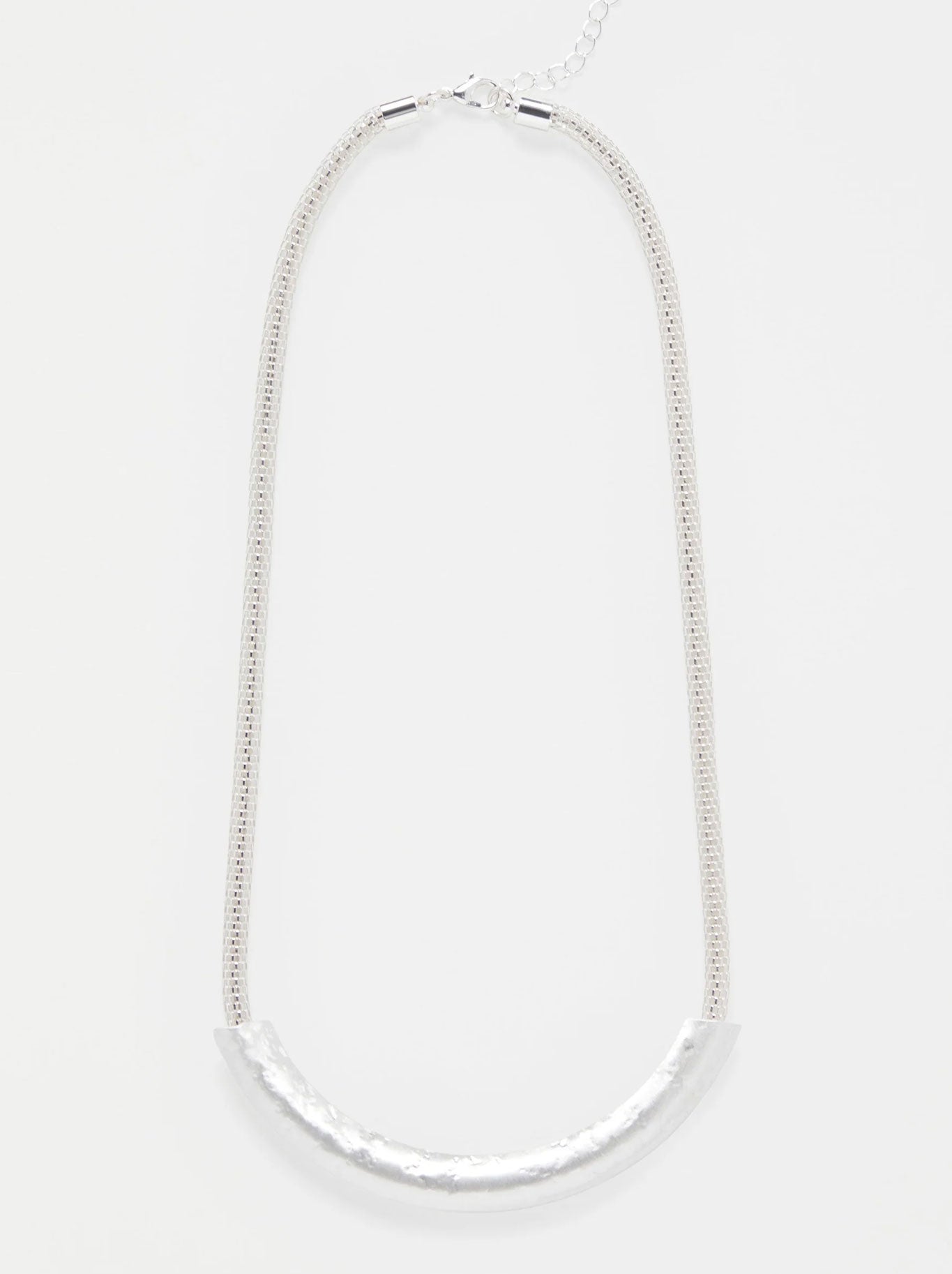 The Gild Necklace joins ELK's classic Gild Collection. A tubular snake chain is looped through a curved half-moon component and secured by jump rings. Resting flat against the chest, this statement piece offers timeless elegance. This necklace has a standard parrot clasp and extension chain. Offered in classic Gold and Silver colourways.