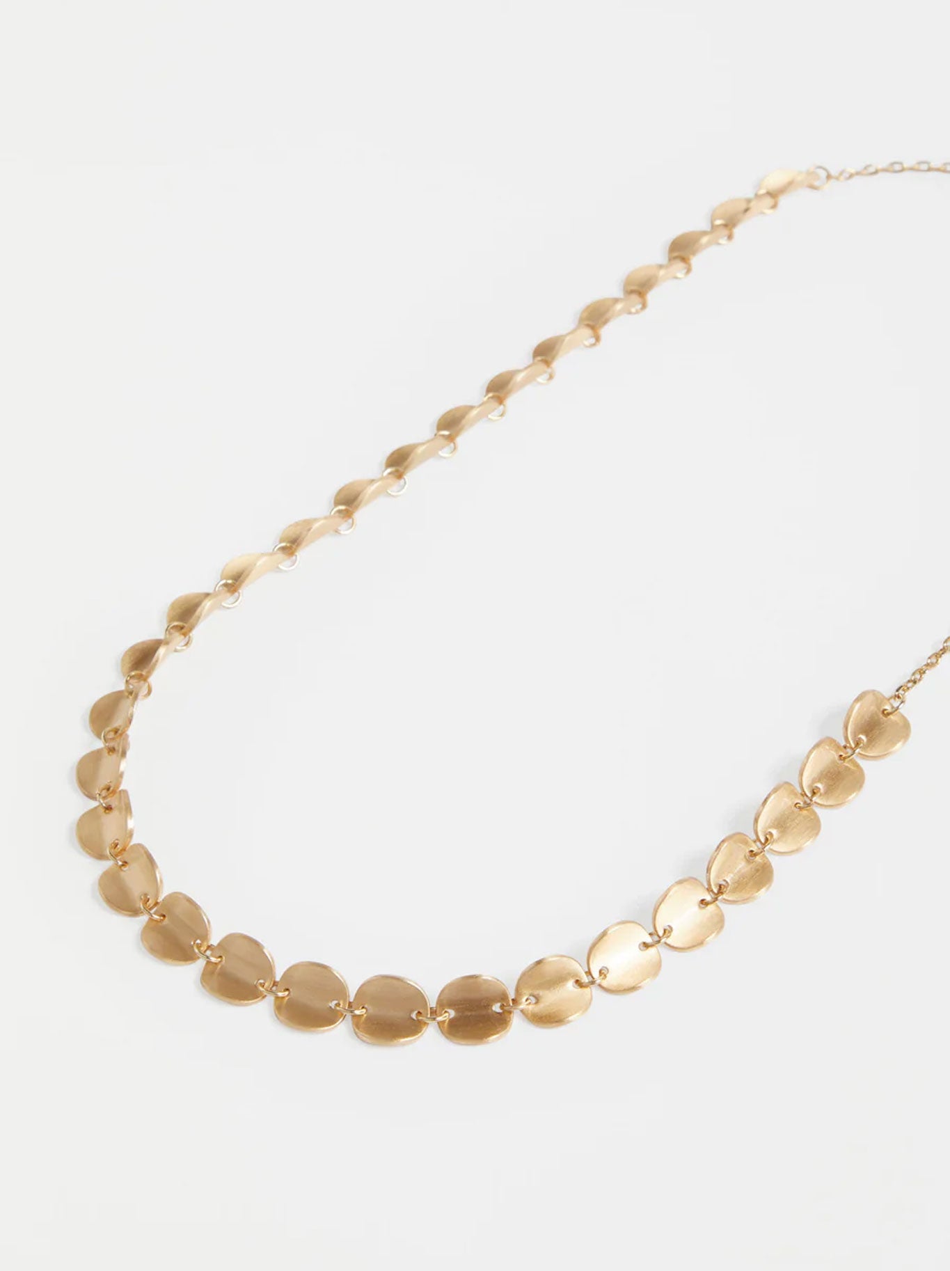 The Elk Torri Necklace features a series of delicate links, asymmetrically arranged along the chain and connected by jump rings. This modern take on the classic chain necklace stands out with its brushed metal finish that beautifully reflects light. Lightweight and versatile, the Torri Necklace is destined to become a staple in both your everyday and off-duty wardrobe. Offered in classic Gold and Silver.