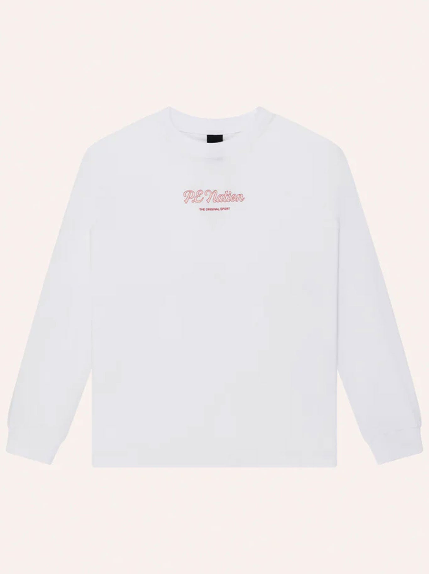 The Formation Long Sleeve Tee in Optic White is made from a 100% mid-heavyweight cotton jersey. This relaxed fit long sleeve tee features a ribbed crew neck and a custom P.E Nation seasonal graphic print on front. Style this tee with a track short, leggings or bike short for laid back days.