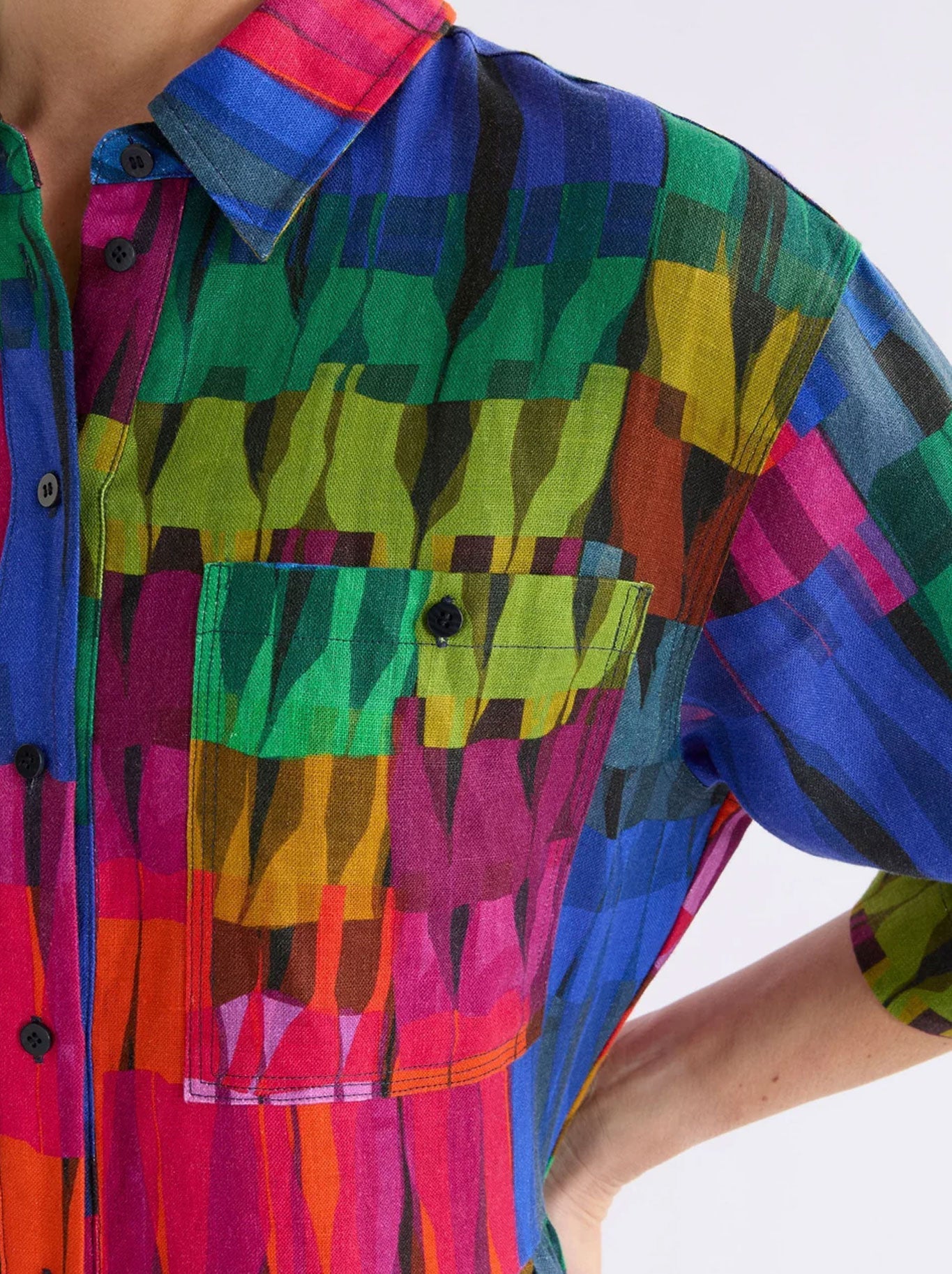 Make a vibrant statement in the Elk Llinen Light Dress, a French linen style in the striking multi-coloured Lind Print. This shirt dress features a button through design and collar, flowing into A-line silhouette with a gathered skirt. A midi to long length dress with flattering elbow length sleeves and two chest patch pockets. French linen is durable and slightly textured and will soften with wear.