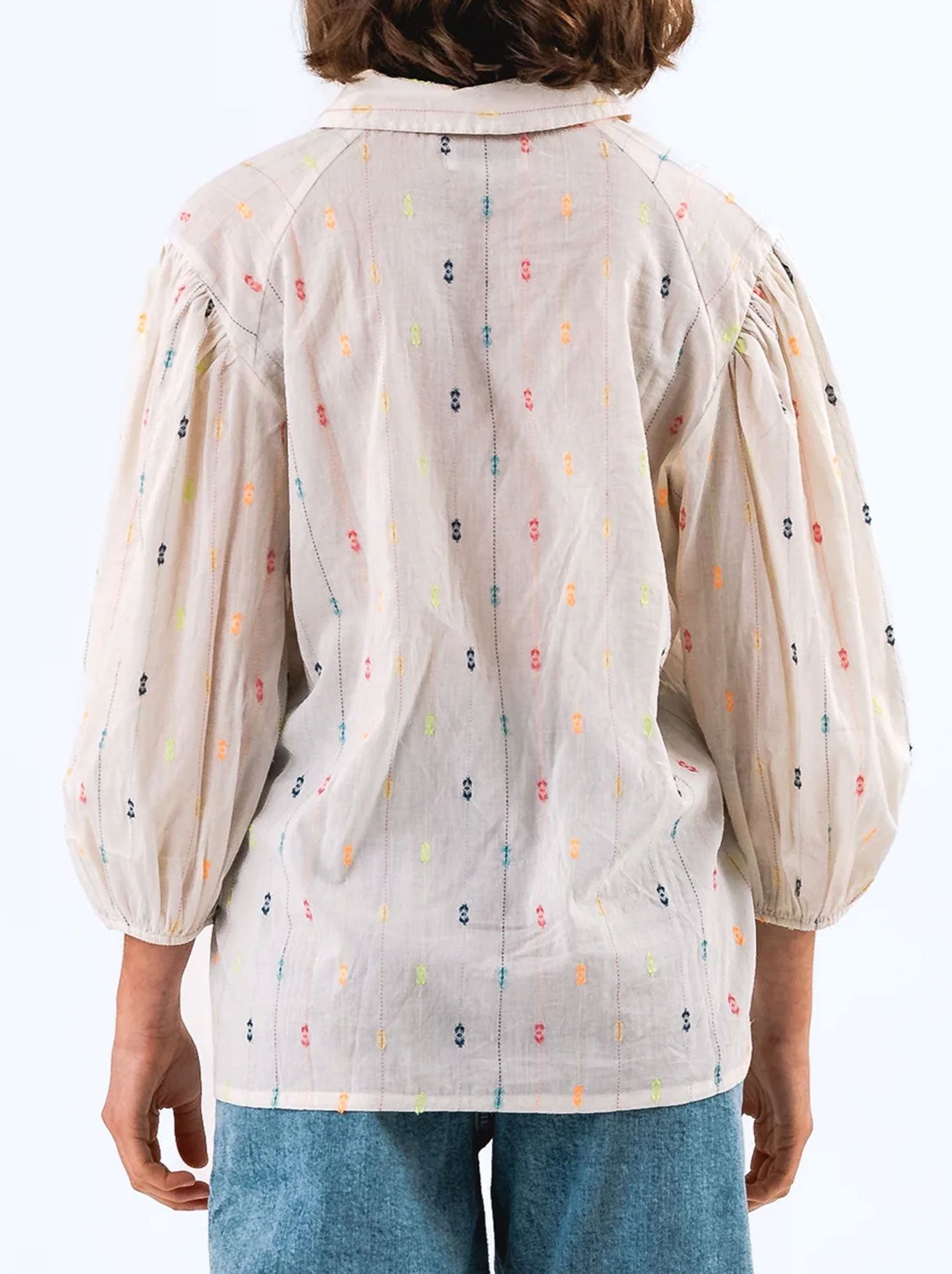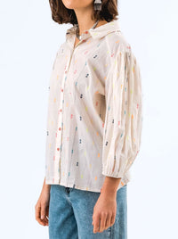 The Lollys Laundry Heidi Shirt features distinctive colourful embroidery, adding subtle detailing. Crafted from soft, textured cotton, it ensures comfort against the skin while maintaining breathability. The full button-down front provides versatility, complemented by ¾-length sleeves featuring delicate pleats, a slight puff, and elasticated cuffs that enhance its feminine silhouette.
