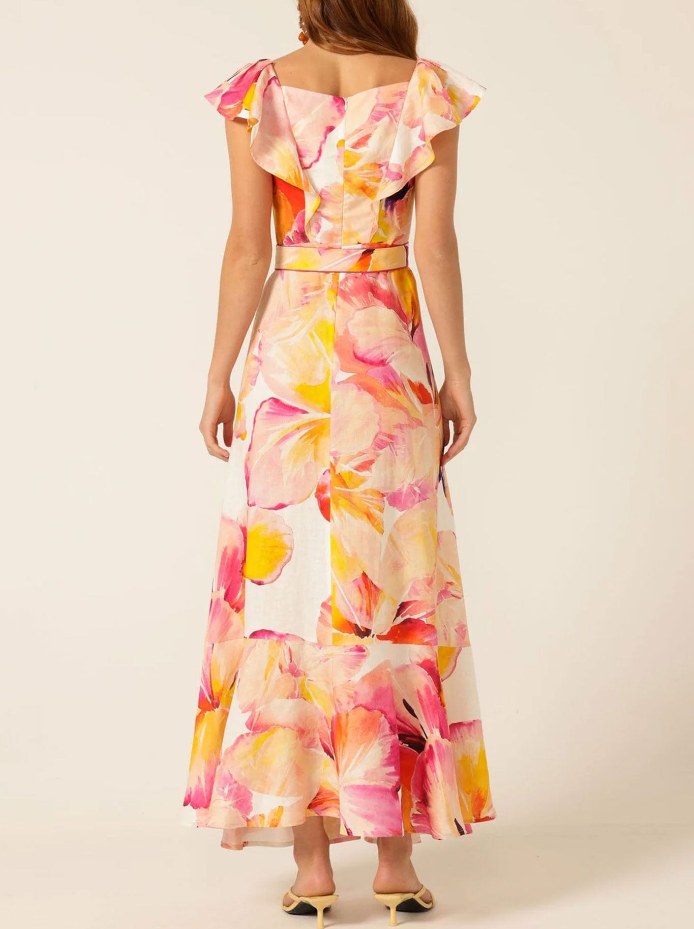 The Summer Fiesta Maxi Dress is made from a luxurious linen in an exclusive Sacha Drake print, featuring fluted cap sleeves and a flowing maxi length. Finished with a detachable self-tie belt adorned with piping and crystal-beaded ends, this dress is easily dressed up or down and is perfect for weddings, events, and luncheons.