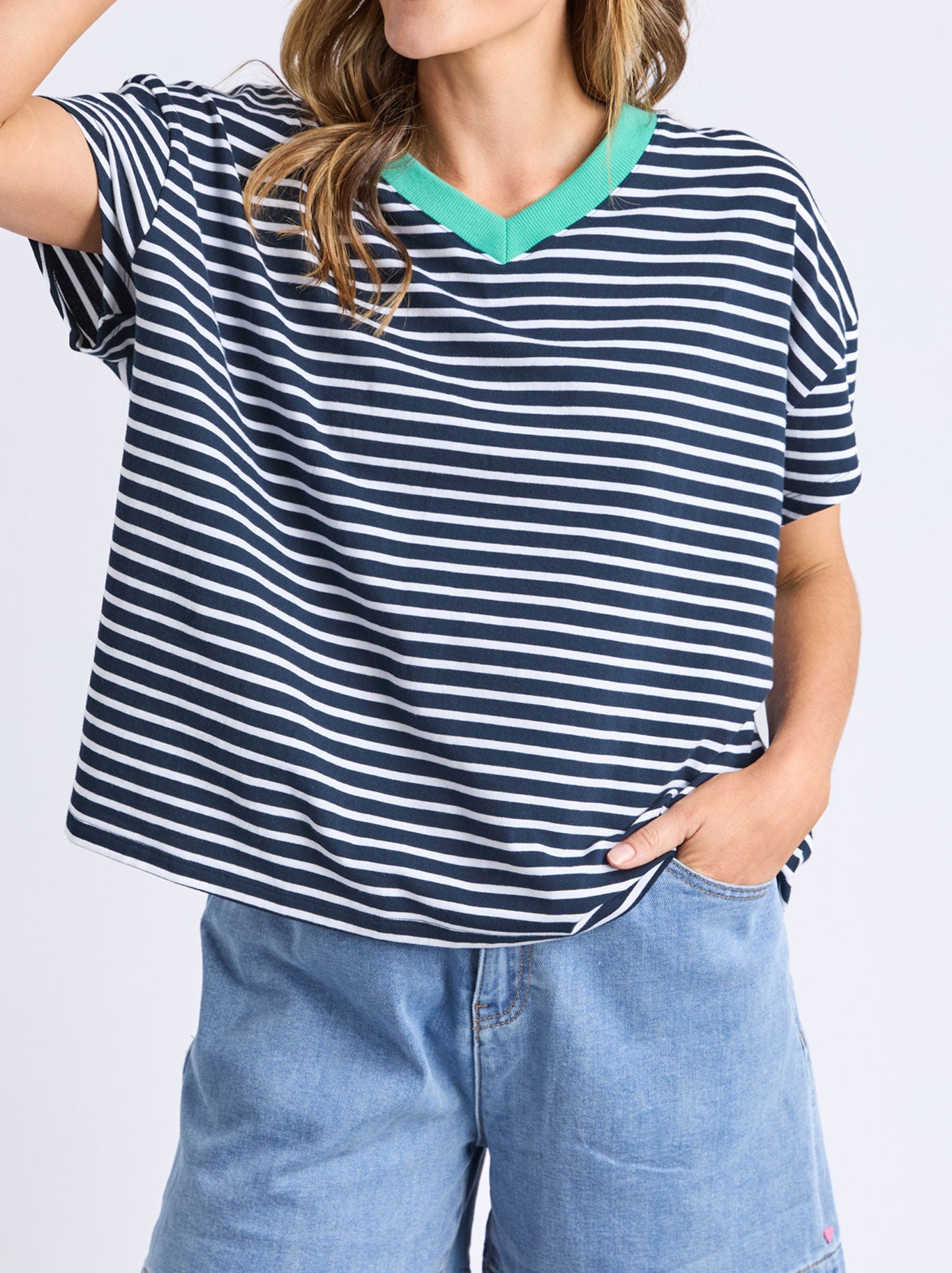 The Sabrina Tee features a loose fit for relaxed comfort and easy movement. Crafted with a yarn-dyed stripe pattern, it offers long-lasting color vibrancy and texture. The V-neck detail adds a subtle, flattering touch that enhances the overall design, making this tee a versatile and refined choice for casual wear.