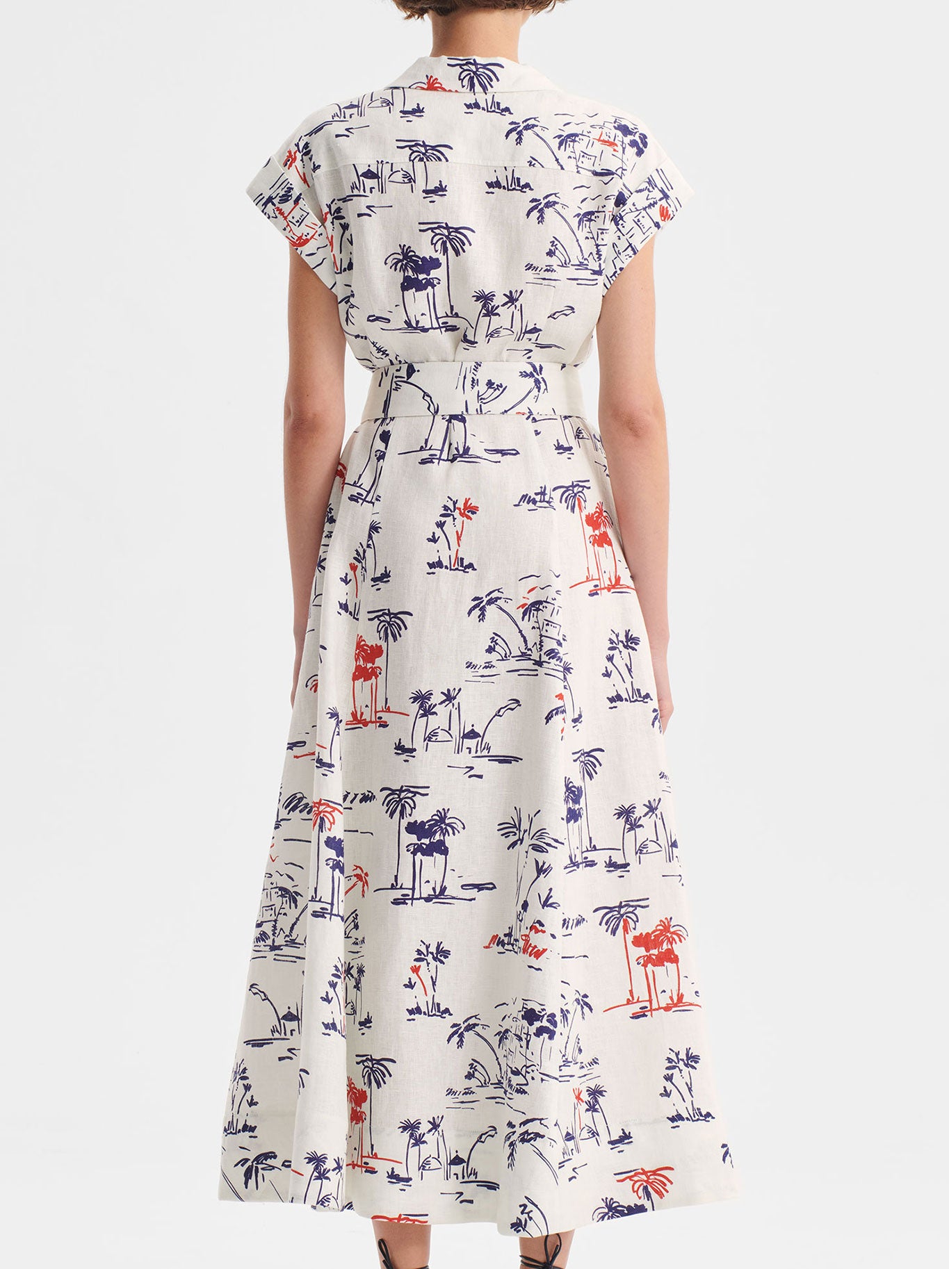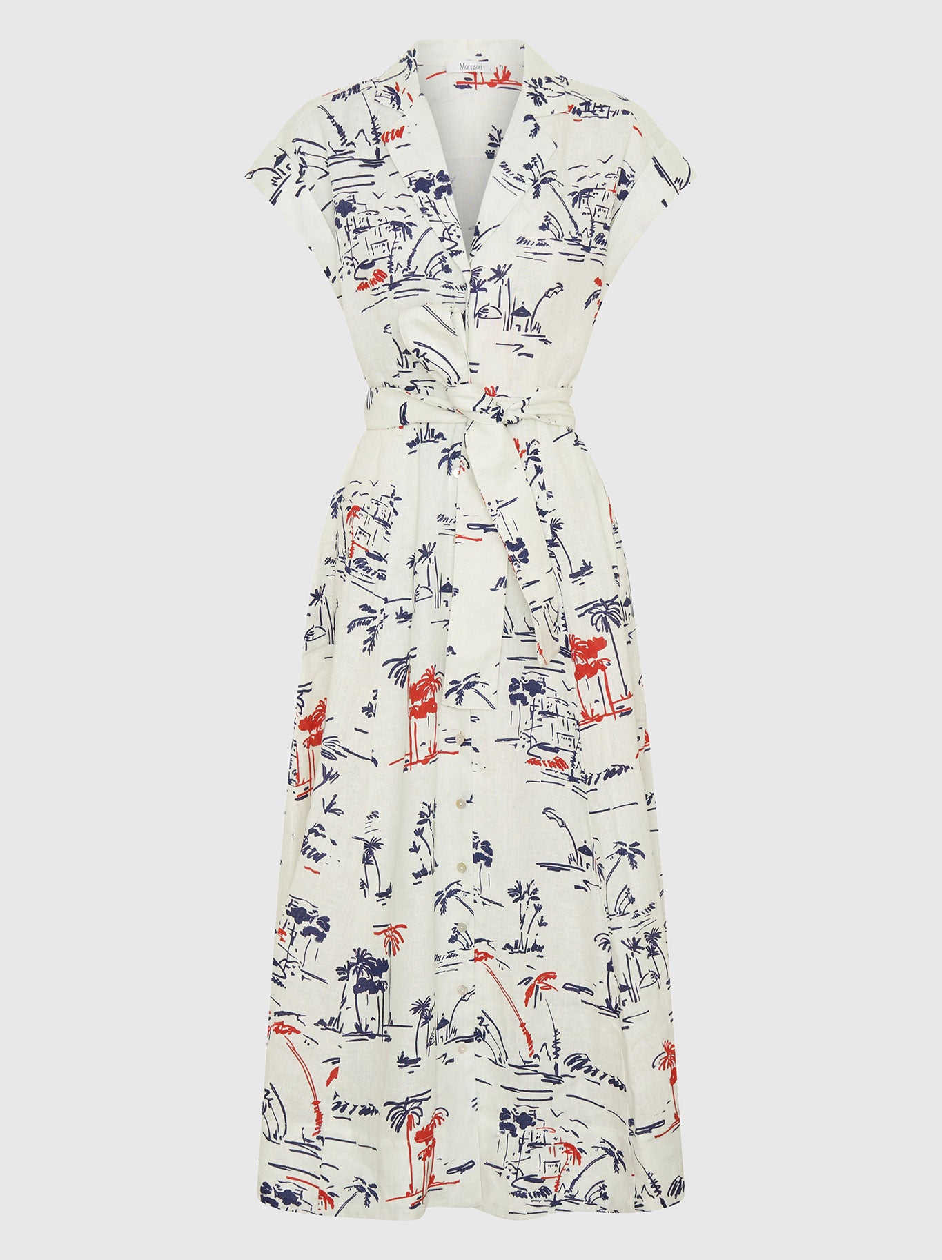 Crafted from midweight linen, this shirt dress showcases an exclusive Morrison print with refined resort styling. The neat-fitting bodice features a button-through front and cuffed cap sleeves, while a self-fabric waist tie defines the silhouette. A full swing panelled skirt creates elegant movement, finishing at midi length for versatile, sophisticated wear.