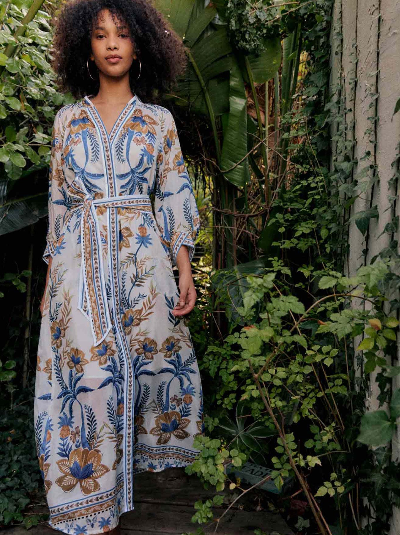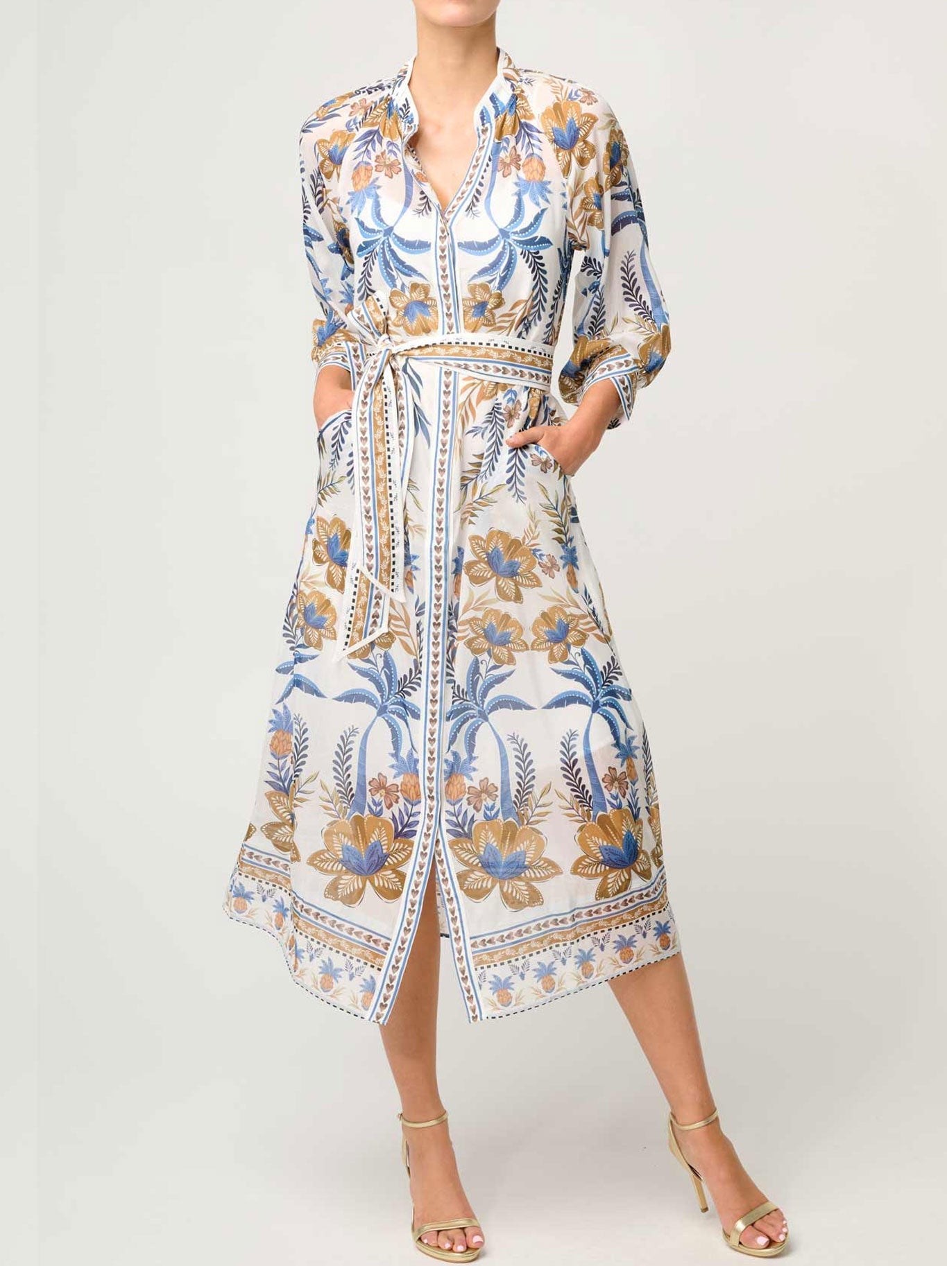 The Golden Medina print is a striking mix of golden tones and rich blue florals, inspired by artisanal patterns and exotic destinations. The design features a button-through front, allowing you to style it closed as a full-length dress or slightly open for a more relaxed, layered look. A removable self-tie belt cinches the waist, offering a customizable fit that flatters every figure. Finishing touches such as the contrast trim detailing and subtle blouson sleeves add depth and polish to this versatile wardrobe hero.